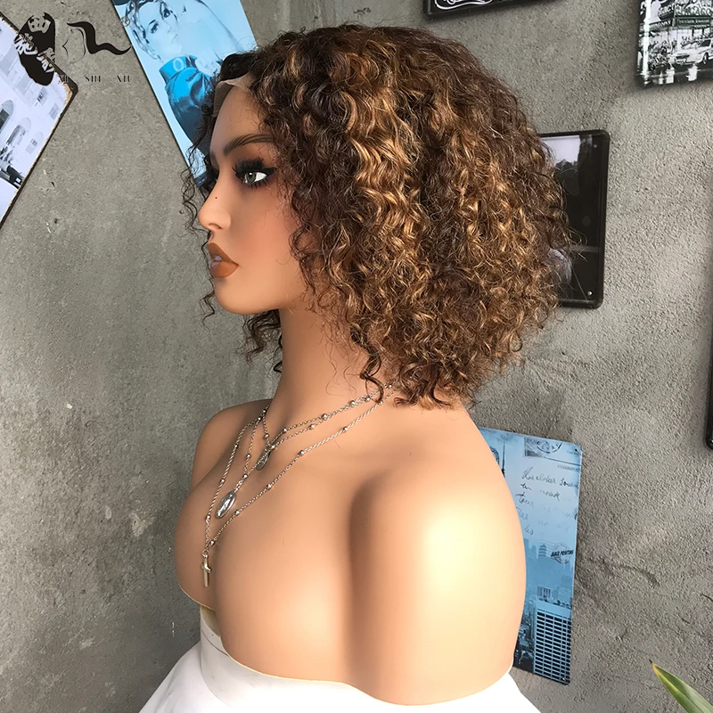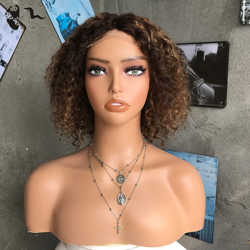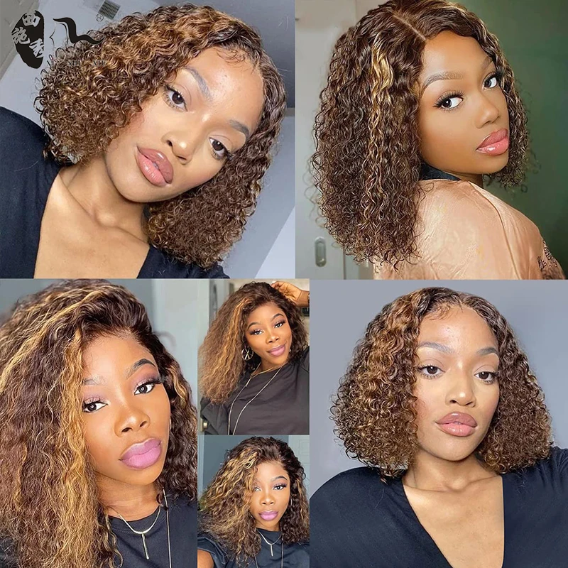 Synthetic Hair Curly Highlight Color Wig Pixie Cut Lace Bob Wig Colored 4×4 T-Part Lace Wigs For Black Woman