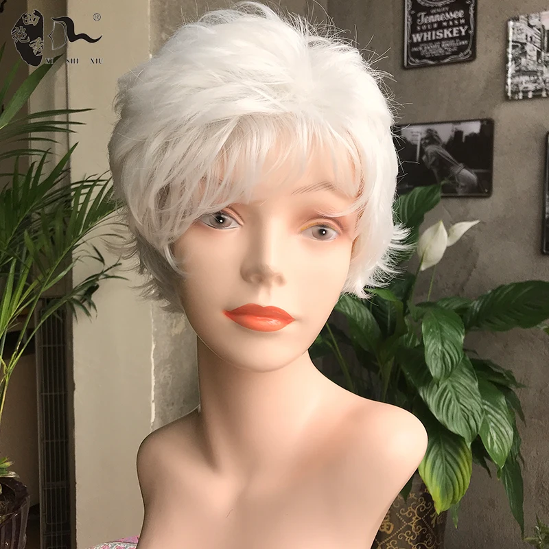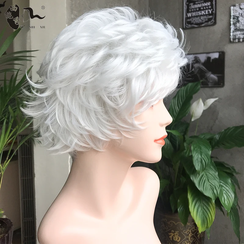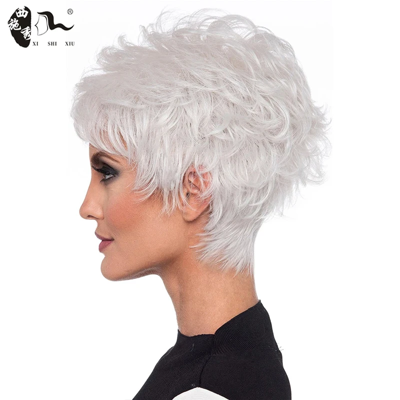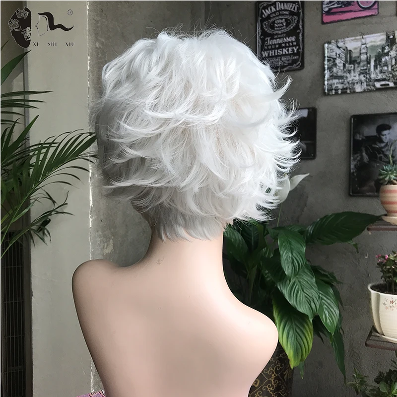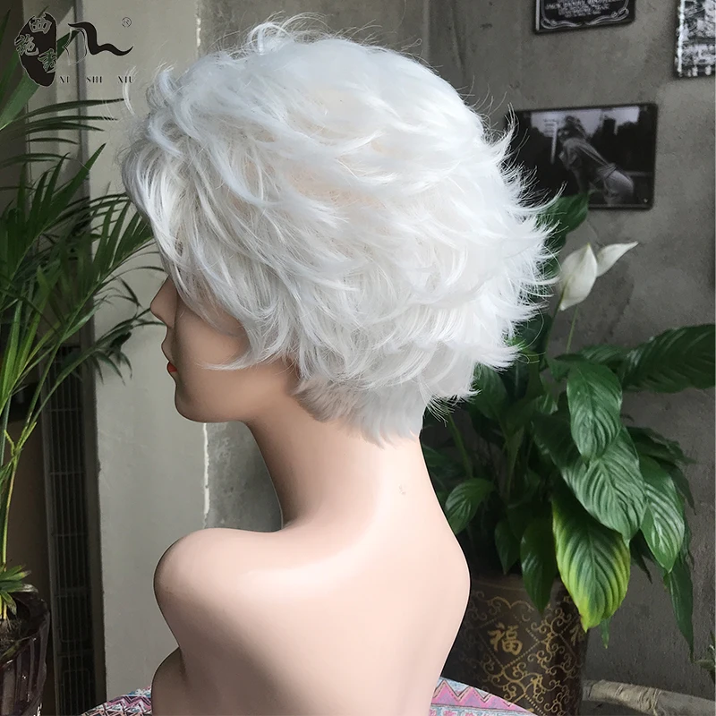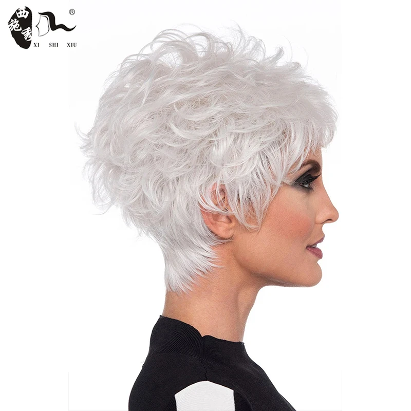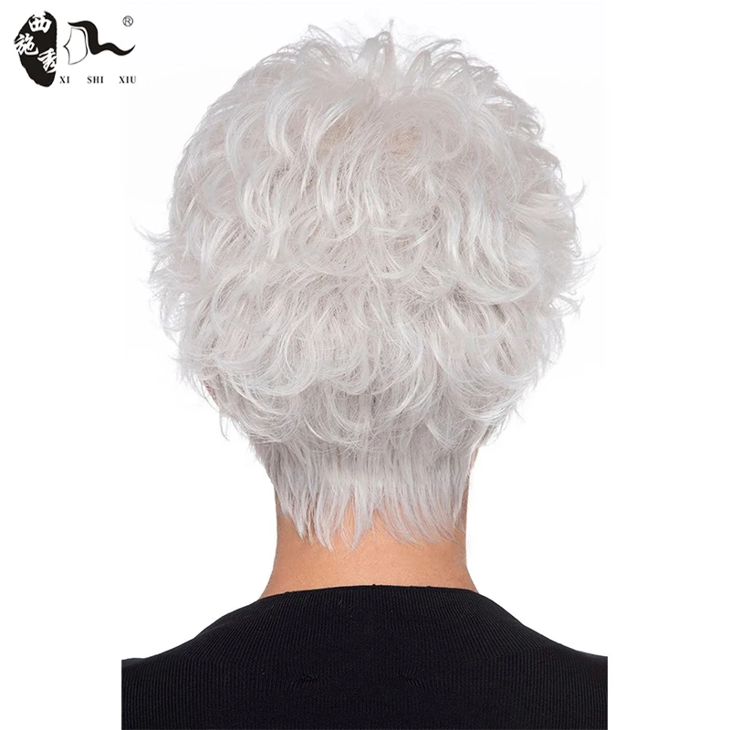 Middle-aged Women Wig Silver White Ombre Synthetic Short Layered Curly Hair Puffy Bangs